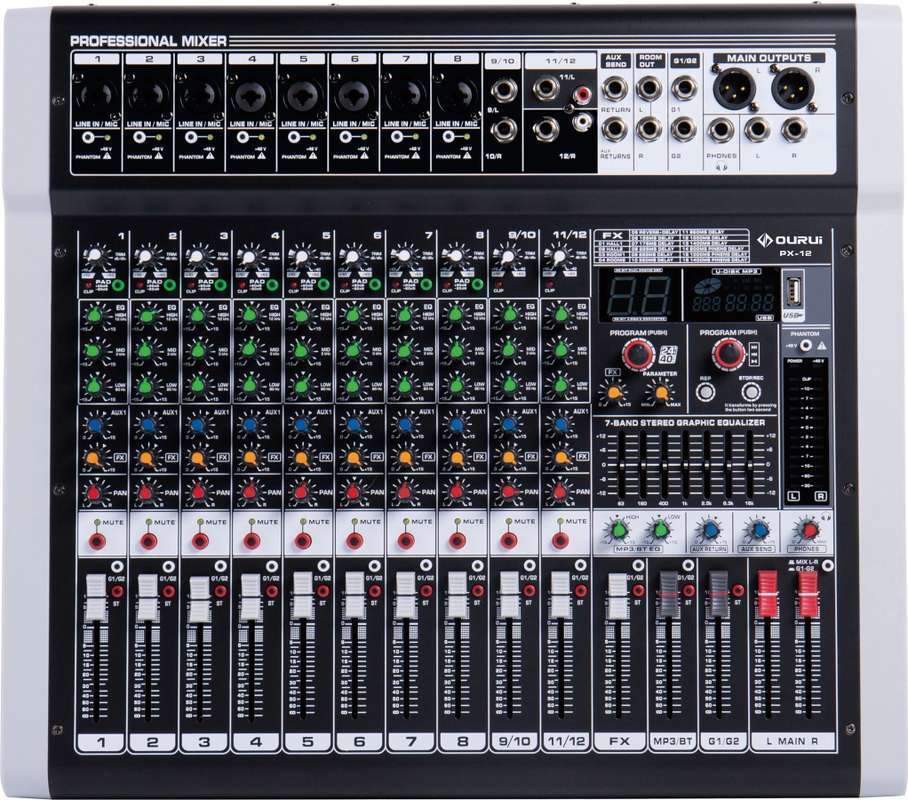 - Подключение Bluetooth и функция записи MP3 через USB. Вставьте USB для воспроизведения музыки или для записи, подключите мобильный телефон к микшеру с помощью Bluetooth соединения.