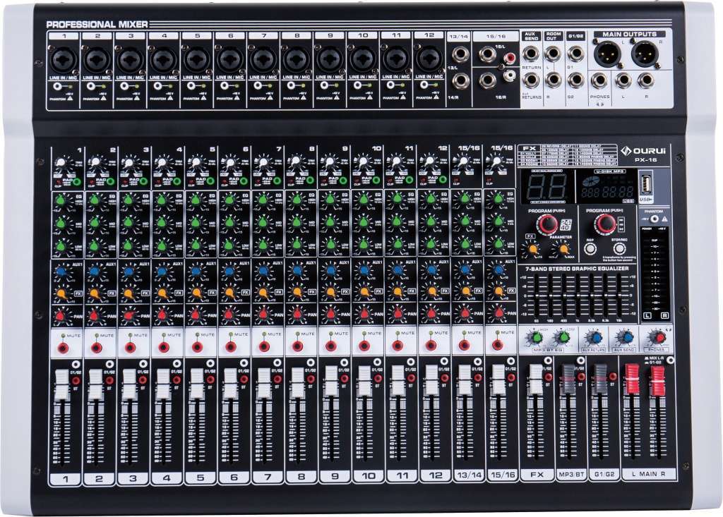 - Профессиональный микшер среднего размера с ультра-малошумящим дискретным микрофонным предусилителем и фантомным питанием 48 В.