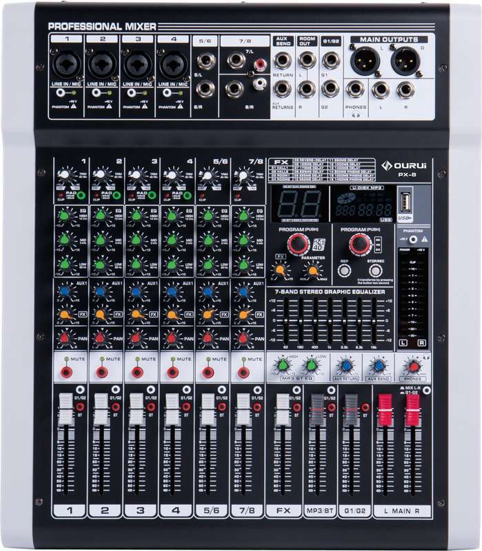 - Подключение Bluetooth и функция записи MP3 через USB. Вставьте USB для воспроизведения музыки или для записи, подключите мобильный телефон к микшеру с помощью Bluetooth соединения.