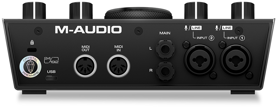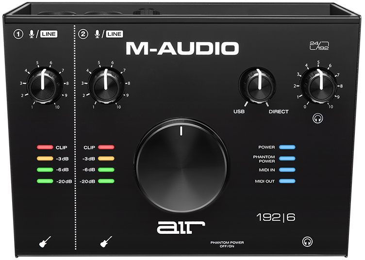 M-Audio AIR 192 | 6 - USB аудио интерфейс, 24бит 192кГц, 2x XLR TRS микрофонный линейный вход, +48 В, 2x 1 4 TS Jack инструментальный вход, 2×1 4 TRS Jack выхода, 1 4 TRS Jack стерео выход на наушники, MiDi In Out, Windows, MacOS.