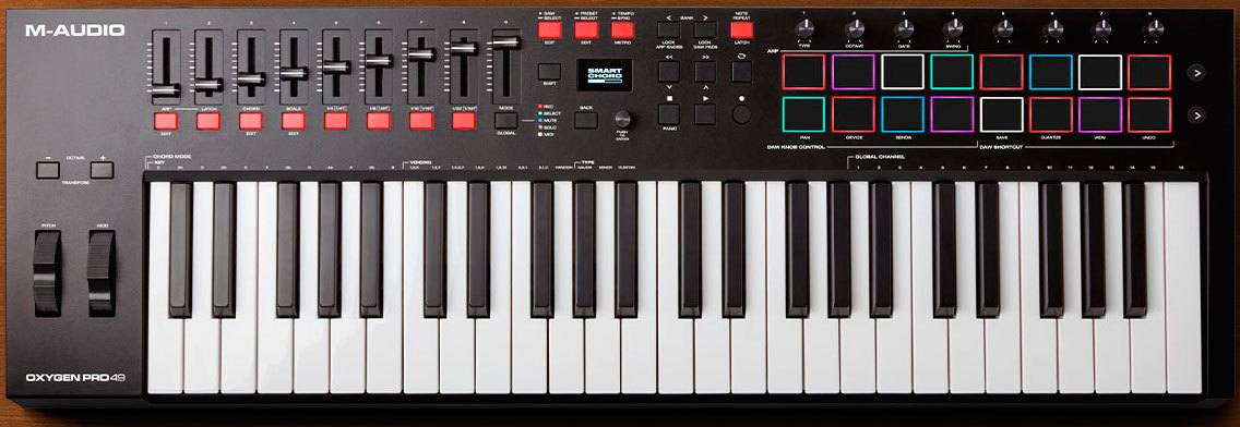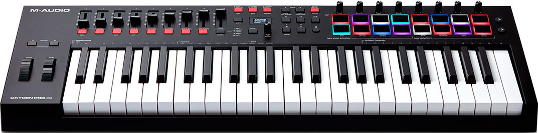 Объединив лучшую в своем классе, чувствительную к скорости нажатия, полувзвешенную клавиатуру с 49 клавишами с послекасанием и назначаемыми зонами, со встроенным арпеджиатором, 16 назначаемых чувствительных к скорости нажатия пэдов с RGB-подсветкой с функцией Note Repeat, 8 назначаемых регуляторов и 9 назначаемых фейдеров, Oxygen Pro 49 имеет всё, чтобы максимально использовать вашу коллекцию виртуальных инструментов и DAW.