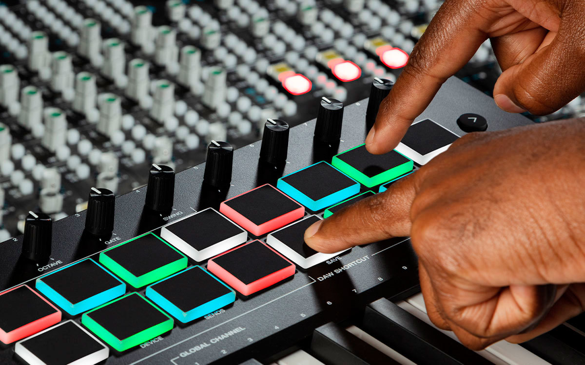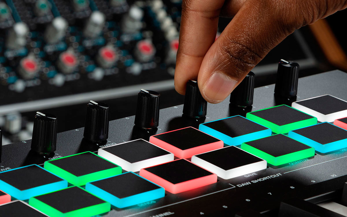 - 16 назначаемых чувствительных к скорости нажатия пэдов с RGB подсветкой и функцией Note Repeat для создания битов, запуска клипов и т. д.