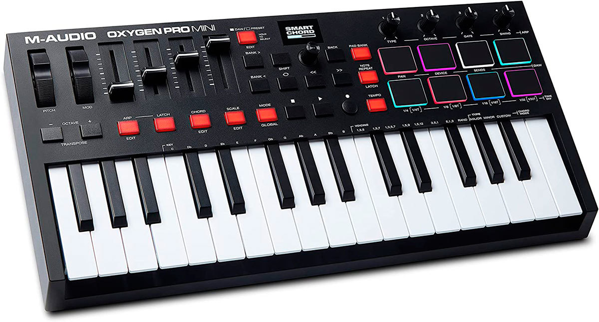 Объединив лучшую в своем классе чувствительную к скорости нажатия, полувзвешенную клавиатуру с 32 клавишами, встроенный арпеджиатор и 8 назначаемых чувствительных к скорости нажатия пэдов с RGB-подсветкой и функцией Note Repeat, которые открывают мир для точного воспроизведения музыки и техники живого звука, чтобы ваша музыка звучала профессионально, 4 назначаемых регуляторов, M-Audio Oxygen Pro Mini имеет всё, чтобы максимально использовать вашу коллекцию виртуальных инструментов и DAW.
