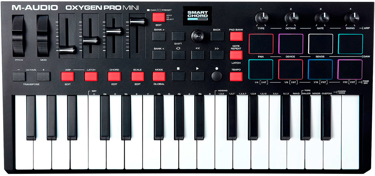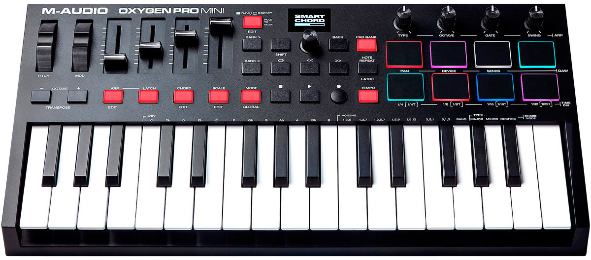 Благодаря технологиям Smart Chord и Smart Scale устраняются любые препятствия на пути создания музыки. Когда Smart Chord активирован, нажатие одной клавиши или пэда будет воспроизводить полный аккорд с простыми в использовании опциями для настройки свойств аккорда и настраиваемых прогрессий на клавиатуре. С помощью интеллектуальной технологии Smart Scale, клавиатура M-Audio Oxygen Pro Mini может быть настроена на один из 16 вариантов гаммы, поэтому воспроизводятся только ноты в выбранной гамме. Результат? Вы тратите меньше времени на преодоление технических препятствий и больше на реализацию своего творческого видения.