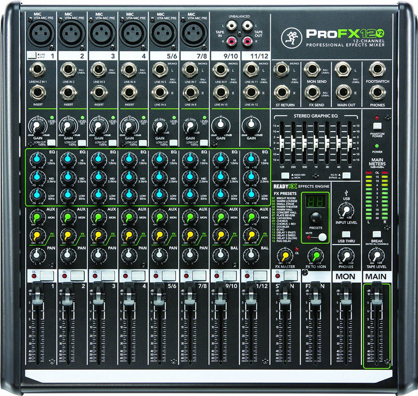 MACKIE ProFX12v2 12-канальный микшер с процессором эффектов и USB. Идеальное решение для живых выступлений групп и ди-джеев, для преподавателей и докладчиков.
