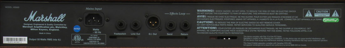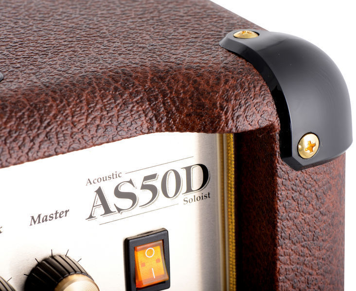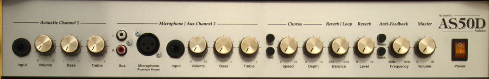 Мастер-секция включает в себя канал переуступки хору со скоростью и глубиной контроля, уровень реверберации, реверберации/эффекты баланса, переключатель фазы, режекторный фильтр анти-обратной связи (80 Гц до 1 кГц) переменного управления частотой и регулятор громкости. Задняя панель содержит вход ножного переключателя, 1/4" линейный выход, выход DI XLR и 1/4" посыла и возврата (петля эффектов) для работы с педалями эффектов. AS50D поставляется со стандартным шнуром питания IEC.