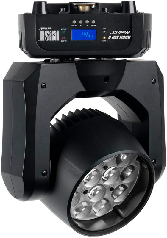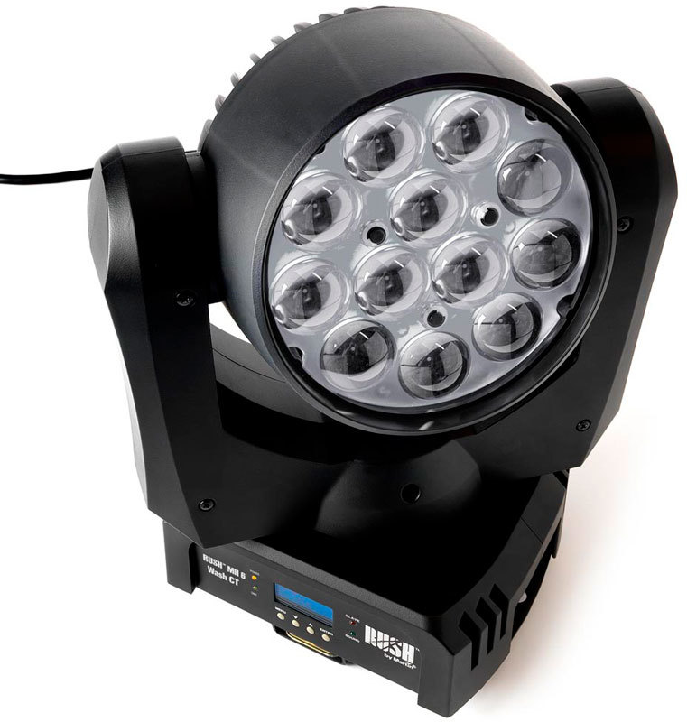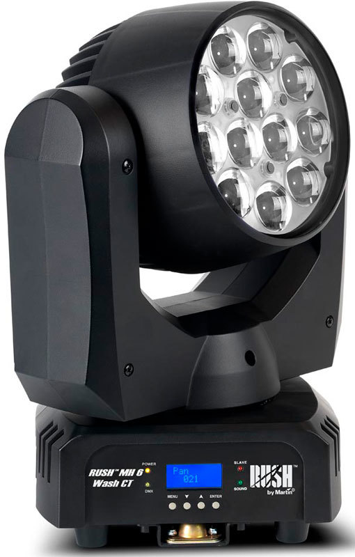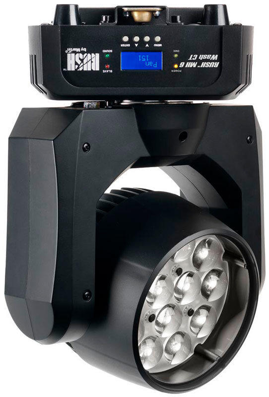 RUSH MH 6 Wash CT - яркий светодиодный прибор с полным вращением, укомплектованный монолинзой. 12 Х 10 Вт диодов (холодного белого и теплого белого света) и моторизованный зум с диапазоном от 10° до 60° дополняют возможности полного электронного диммирования, создания стробирующих эффектов и управления по DMX протоколу.
