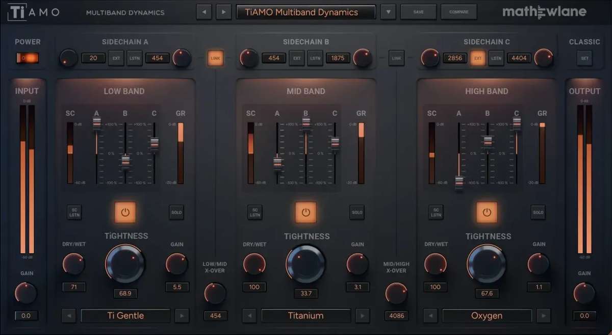 В режиме CLASSIC TiAMO работает как типичный 3-полосный компрессор. В INIT-состоянии он загружается именно так, и вы всегда можете вернуться к этим классическим настройкам сайдчейна и кроссовера за 2 секунды, нажав кнопку SET в правом верхнем углу. В такой конфигурации TiAMO сам по себе является мощным, отлично звучащим многополосным компрессором в аналоговом стиле.