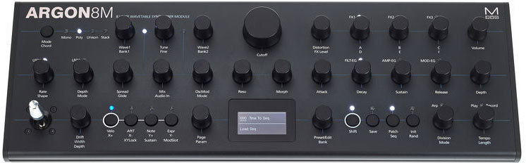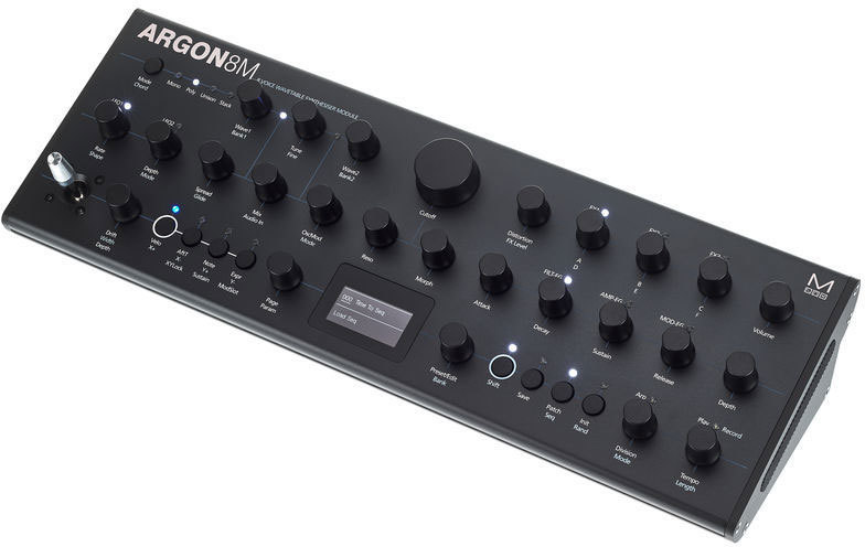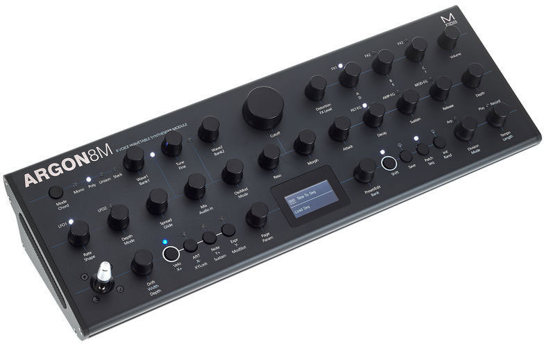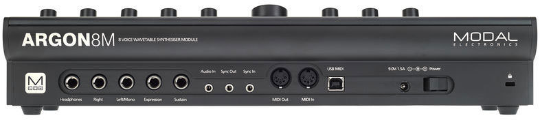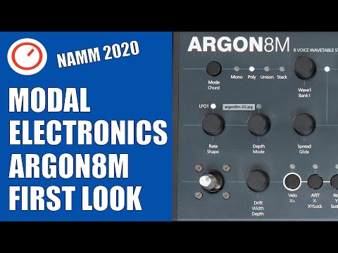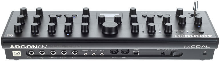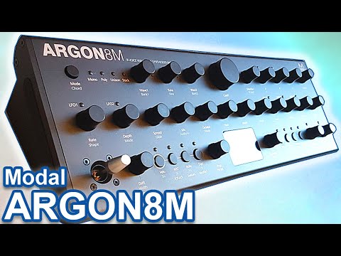 Modal Argon8M – бесклавиатурная рэковая/настольная версия 8-голосного монотембрального полифонического таблично-волнового синтезатора Argon8. Синтезатор имеет 120 форм волны в 24 банках, включая волновые таблицы Modal 002, EDM, таблицы аналогового стиля и математически генерированные. Эти формы могут смешиваться для создания более сложной формы. Регуляторы Voice Drift и Width помогают создавать глубокие стереофонические звуковые картины.