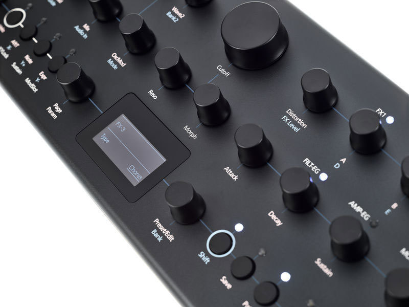 Специальный назначаемый джойстик для регулировки модуляции может двигаться в 4 плоскостях и снабжен возвратной пружиной. Мощный секвенсор на 512 шагов позволяет записывать 4 линии автоматизации. Имеется продвинутый арпеджиатор. 1,5” дисплей позволяет видеть различные параметры и графическое изображение формы волны.