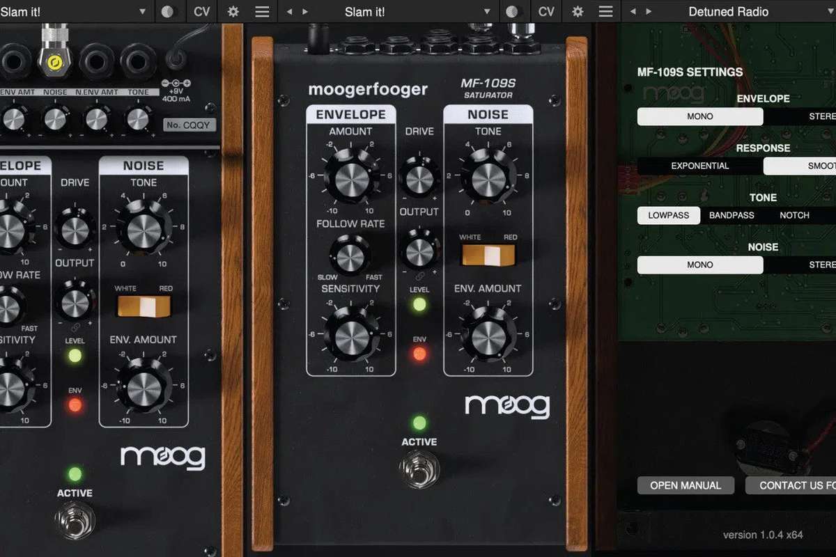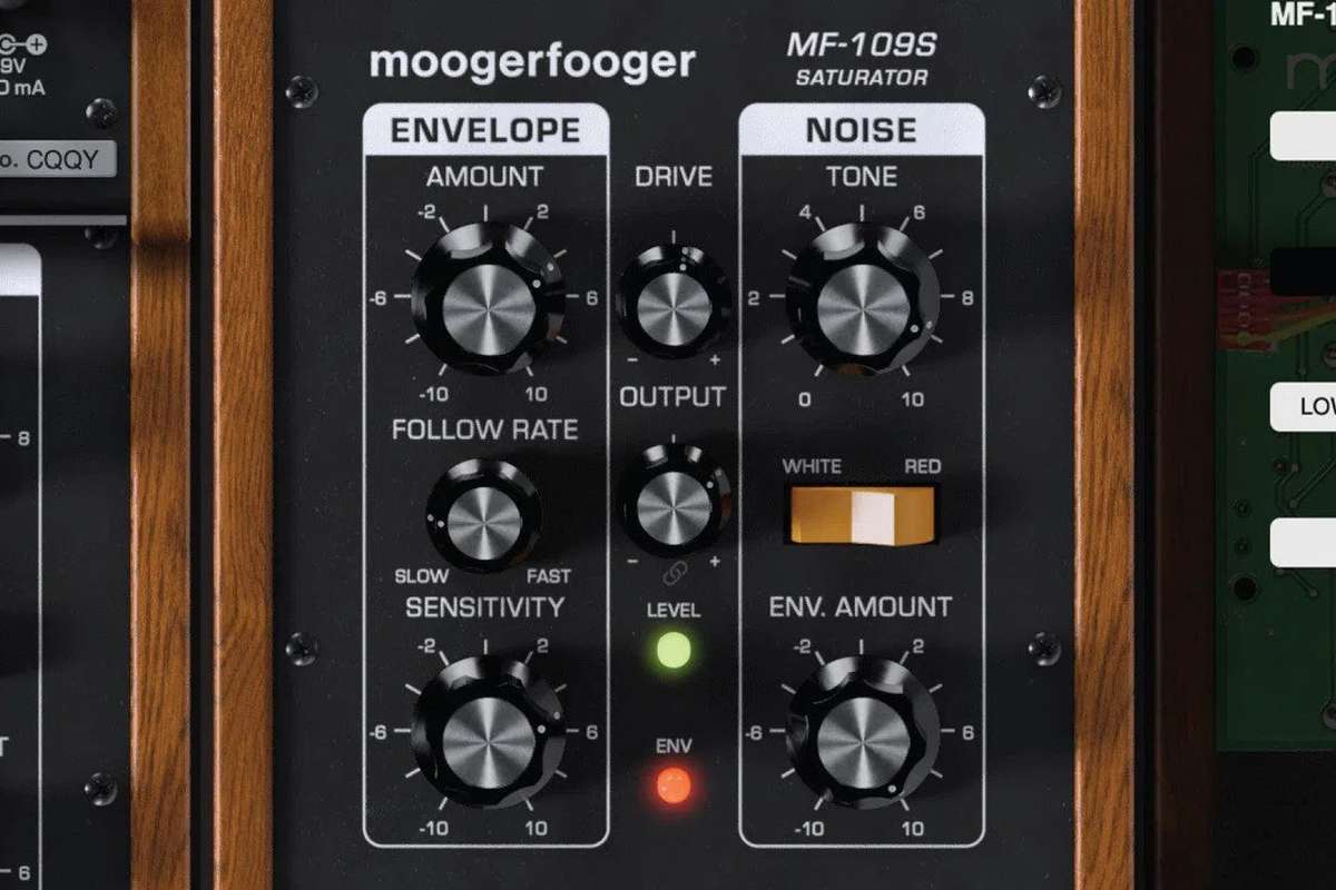 MF-109S Saturator способен переходить от плотного, динамичного овердрайва и аналогового насыщения к плавной компрессии и экспандированию, сочетая широкодиапазонный детектор огибающей с биполярным управлением уникальной драйв-цепочкой плагинов Moogerfooger Effects. Кроме того, он моделирует схему генератора шума Minimoog Model D и позволяет контролировать как уровень генератора шума, так и тон шума с переключаемым типом фильтра. Детектор огибающей и выходы управляющего напряжения (CV) шума, а также множество CV-входов MF-109S позволяют ему взаимодействовать со всеми остальными плагинами Moogerfooger Effects.