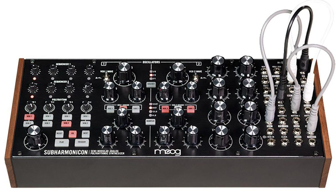 Moog Subharmonicon — полумодульный аналоговый синтезатор и секвенсор. Работает на основе двух VCO-осцилляторов и 4-полюсного фильтра и способен воспроизводить тембры в широком частотном диапазоне. Два 4-шаговых секвенсора помогут пользователю создавать сложные полиритмические модуляции и тембральные наслоения. Subharmonicon может работать и как автономный инструмент, и как элемент рэкового рига.