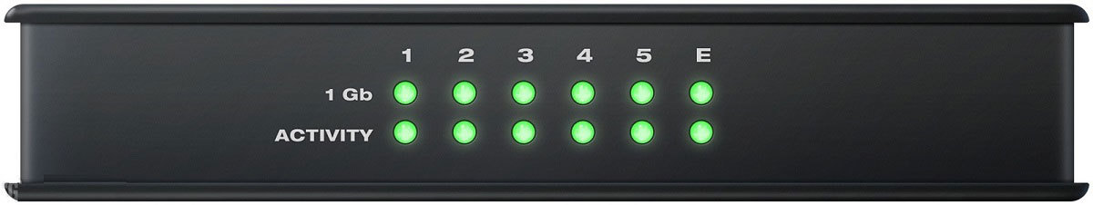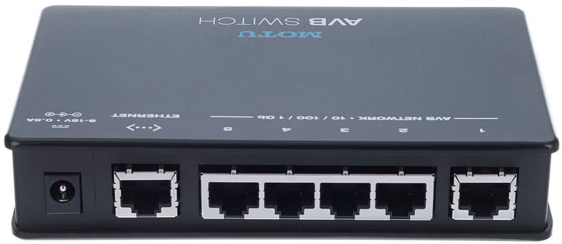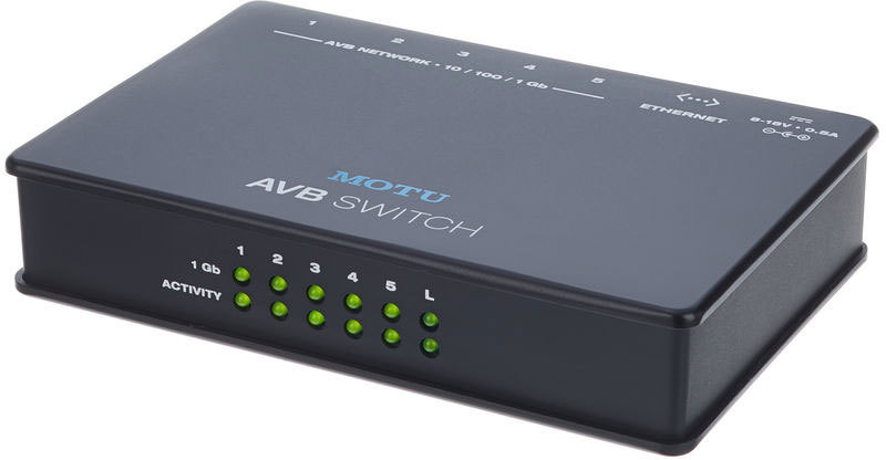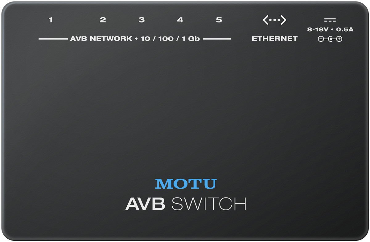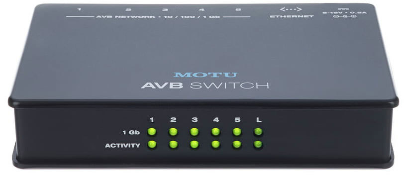 Коммутатор MOTU AVB Switch позволяет объединить до пяти звуковых интерфейсов AVB, при использовании нескольких коммутаторов можно строить и более сложные системы.