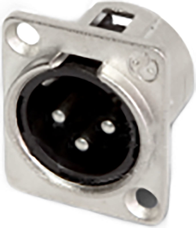 MRC MRX3PM-G-D - панельный разъем XLR, 3-х контактный <штекер/папа>, фланец D-типа, вертикальная установка, металлический никелированный корпус, контакты - покрытие золото, под пайку.