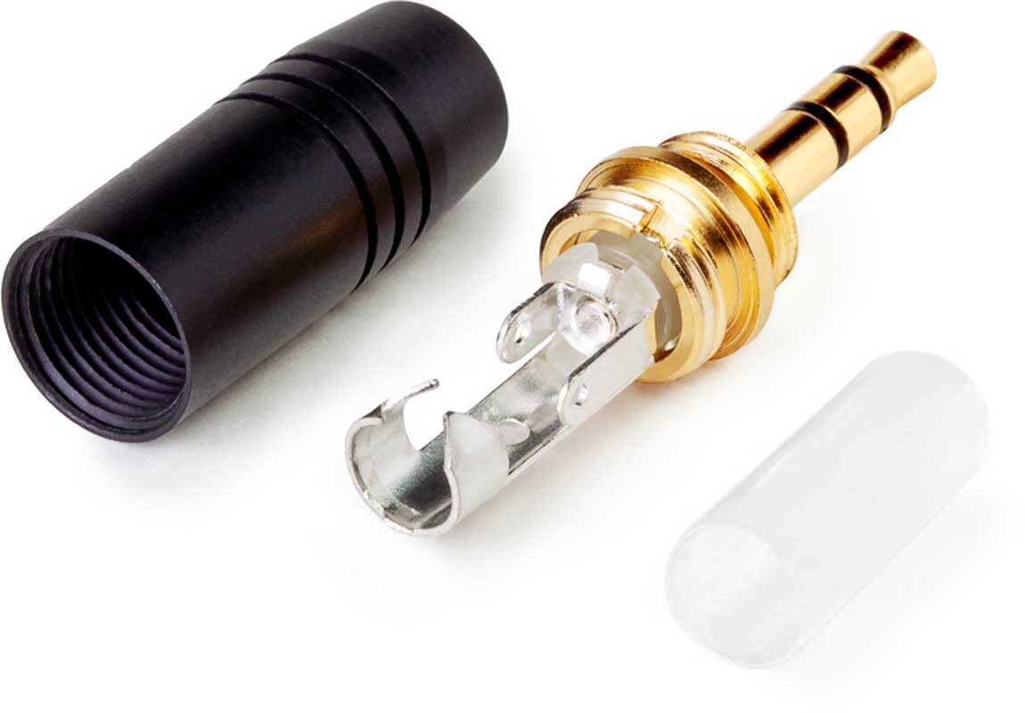 MRC R35CT-BP3-B Кабельный разъем mini Jack 3.5 мм, 3-х контактный (стерео) <штекер/папа>, с резъбой, черный металлический корпус, контакты - покрытие золото, под пайку, на кабель диаметром до 6.5 мм