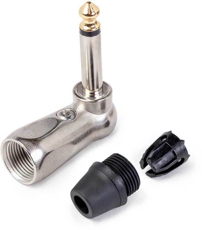 MRC R63SL64A-P2R Кабельный разъем 1/4" Jack 6.35 мм, угловой, 2-х контактный (моно) <штекер/папа>, металлический никелированный корпус, контакты - покрытие никель, терминирование без пайки, пластиковый колпачок черного цвета, на кабель диаметром до 6.4 мм