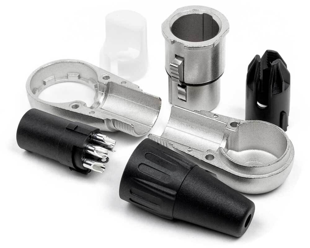 MRC RXCE-4FR Кабельный разъем XLR, 4-х контактный <гнездо/мама>, угловой, E-серия, 5 положений вывода кабеля, металлический никелированный корпус, контакты - покрытие серебро, под пайку, полиуретановый колпачок на кабель диаметром (3.5-8.0 мм)
