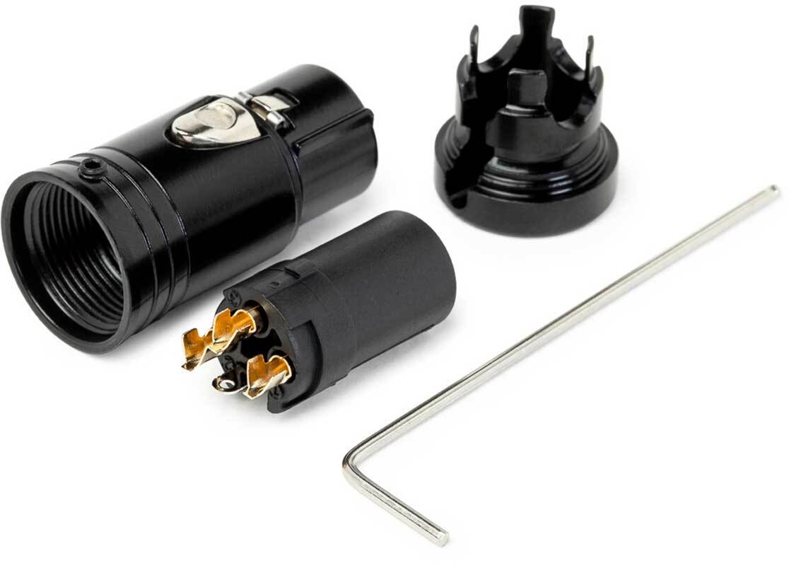MRC RXCW-3FR-B Кабельный разъем XLR, 3-х контактный <гнездо/мама>, угловой, укороченный корпус, W-серия, выводом кабеля под углом 90° со свободным выбором направления, черный металлический корпус, контакты - покрытие золото, под пайку, полиуретановый колпачок на кабель диаметром (3.5-4.0 мм)