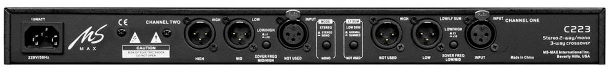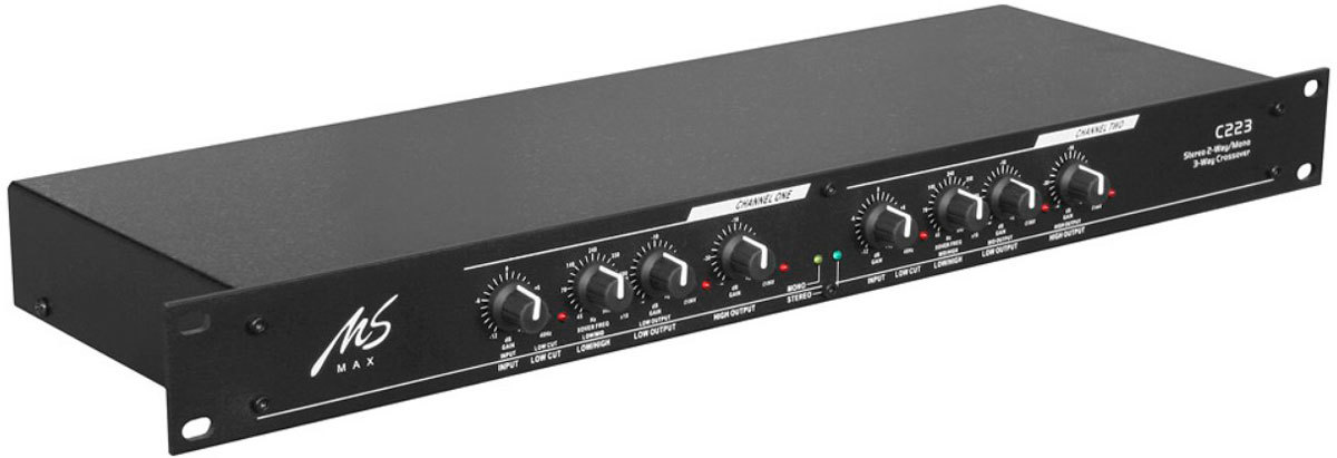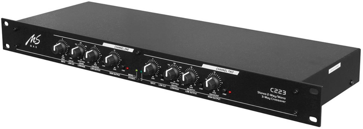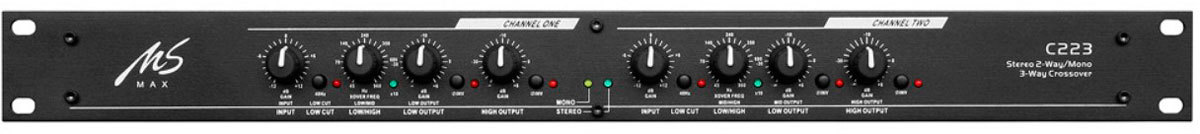 Ms-Max C223 - аналоговый кроссовер – 2-х полосный стерео или 3-х полосный моно, с функциями шумопонижения, фильтра высоких частот и раздельного переворота фазы. Включаемый фильтр высоких частот (40Гц), фильтр шумопонижения.