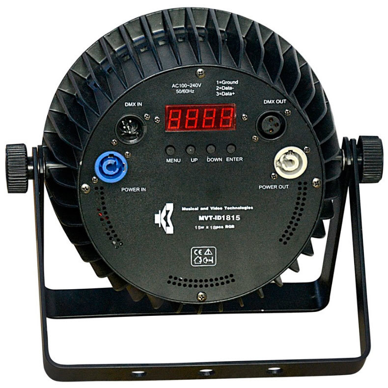 MVT ID1815 - Светодиодный прожектор LED PAR. Светодиоды: 18*15Вт RGBWA+UV 6в1, Разъемы: 2 x 3pin DMX (вход/выход), Комплектация: Сигнальный кабель-переходник 3pinDMX; Сетевой кабель-переходник PowerCON, Страховочный тросик; струбцина.