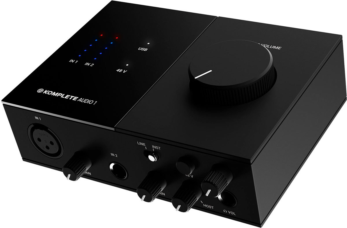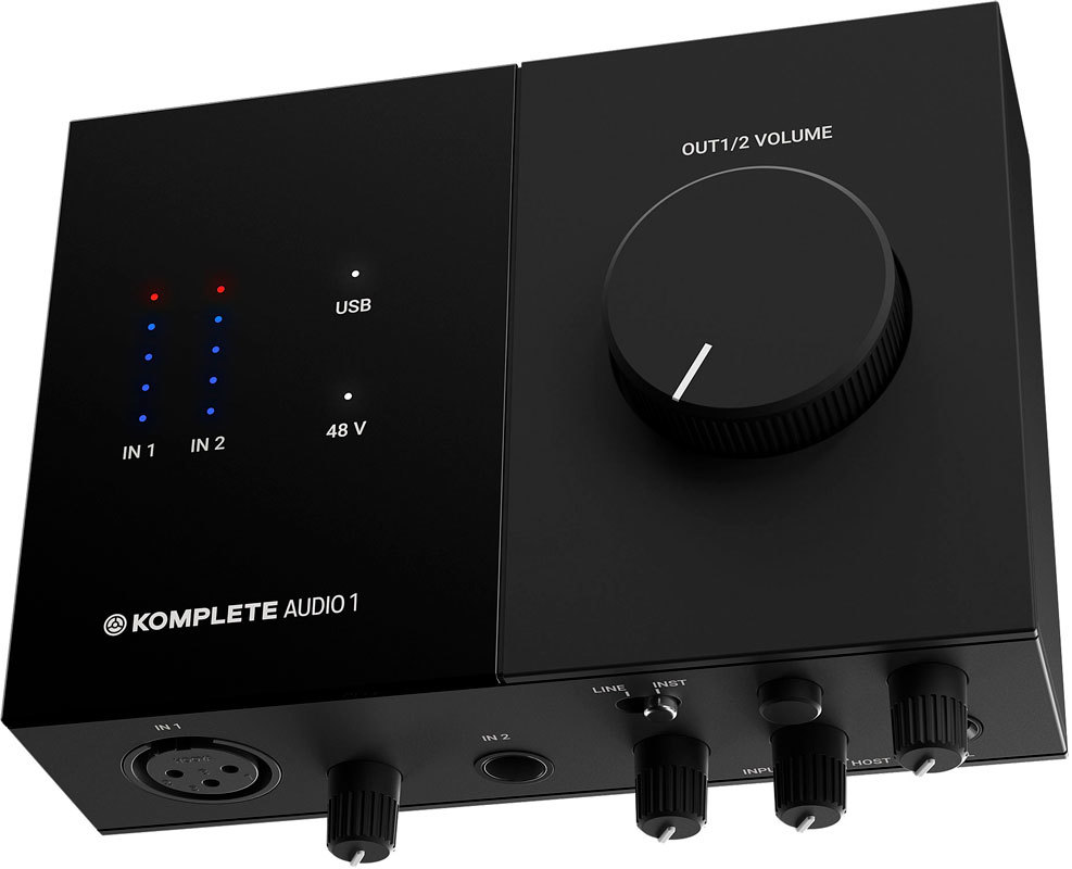 На верхней панели интерфейс оборудован светодиодными VU-измерителями и большой ручкой настройки громкости, как у Audio 6. Komplete Audio 1 наделен функциями прямого мониторинга и регулятором input/host, которые дают возможность прослушивать себя во время записи. Простой и стильный аудиоинтерфейс с питанием от USB, хорошим качеством записи и воспроизведения отлично подойдет для использования в домашней студии.