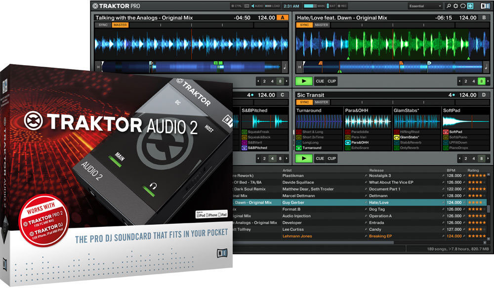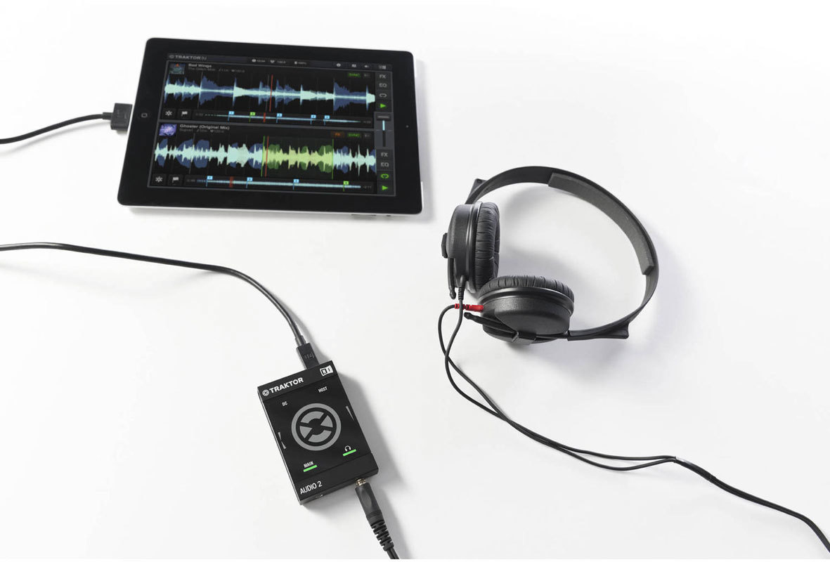 В комплекте с Traktor Audio 2 Mk2 идёт ПО Traktor LE 2 и кабель для подключения к разъёму Lightning, с которым вы сможете превратить свой айфон или айпад в настоящую мобильную диджей-систему. Собственно этим и отличается Traktor Audio 2 Mk2 от предыдущей версии - поддержкой устройств Apple. Согласитесь, что телефон или планшет с установленным ПО значительно удобнее и легче ноутбука, а вес багажа для мобильного диджея - не последний фактор.