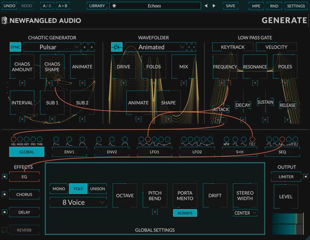 Почти все параметры в Generate могут модулироваться комбинацией двух генераторов огибающей (Envelope Generators), двух LFO, генератора Sample and Hold/Random, 8-шагового секвенсора (Step Sequencer), а также источников MIDI и MPE. Инновационный интерфейс модуляции позволяет легко и быстро соединить любую комбинацию источников с любым назначением, создавая звуки, которые движутся и которые трогают вас.