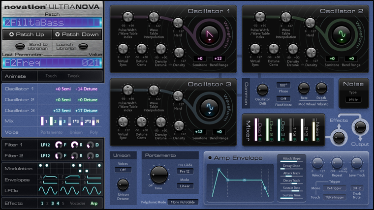 Аналоговый синтезатор, движок Supernova II, 37 velocity&aftertouch клавиш, 18 голосов, 14 фильтров, 36 волновых табл., микр. XLR вх., 2х4 1/4'' Jack вх./вых, цифр. SPDIF вых., 1/4'' Jack вых. для наушников, вх. для педал. сустейна/экспрессии, MIDI, USB