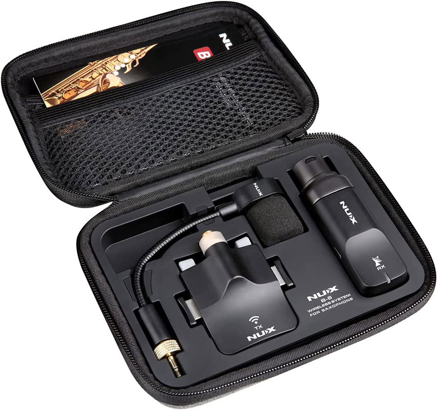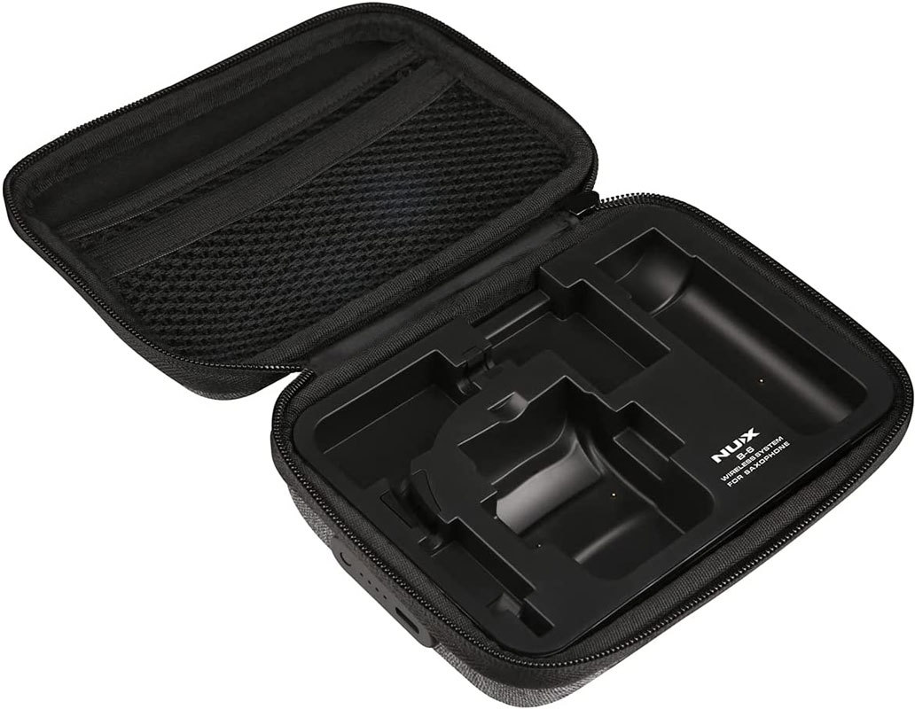 Беспроводная система NUX B-6 для саксофона также поставляется с футляром для хранения, который может заряжать передатчик и приемник одновременно, обеспечивая до 15 часов дополнительного времени автономной работы.