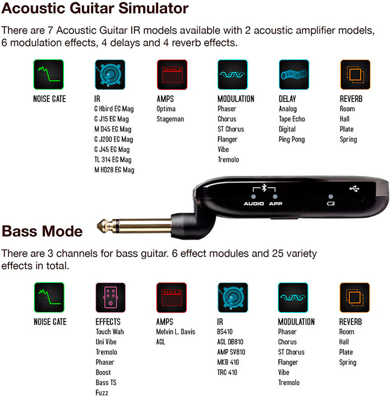 - Гитарные каналы: Clean - Overdrive - Distortion - Акустическая Гитара