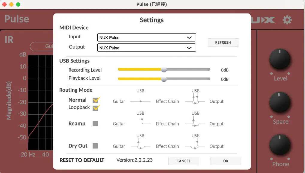 Pulse IR-Loader предлагает схемы True-bypass и Buffer-bypass (Trails), просто удерживайте переключатель, чтобы включить педаль (не подключайте USB). Индикатор ножного переключателя покажет вам состояние схемы обхода. (Если при загрузке педали индикатор FS мигает "зеленым" = BF, "красным" = TB.)