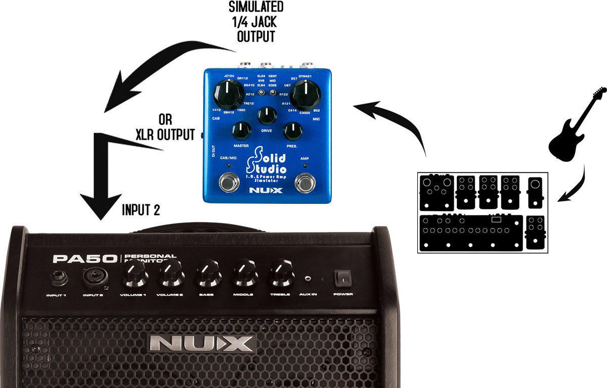 - Канал 2: 6,35 мм (1/4") небалансный и XLR балансный комбо-вход, к которому вы можете подключить все, что угодно, включая микрофон. Полностью плоский вход большой точности, разработанный для совместимости с IR загрузчиками, такими как Nux Solid Studio