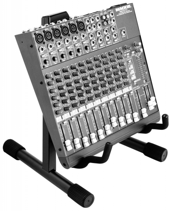 - Подставка запатентованной формы уверенно держит акусические и электрогитары, а также настольные микшеры и комбоусилители.