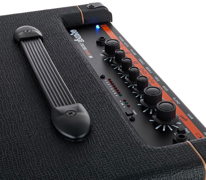 Разработка обновлений этого комбика была вдохновлена флагманскими линейками басовых усилителей ORANGE OB1 и 4 STROKE, сочетание отличительных особенностей которых было сведено в один компактный комбо. CRUSH BASS 50 через динамик 12" выдает 50 полновесных Ватт жирного и упругого низа благодаря аналоговой схеме и новому портированному кабинету.
