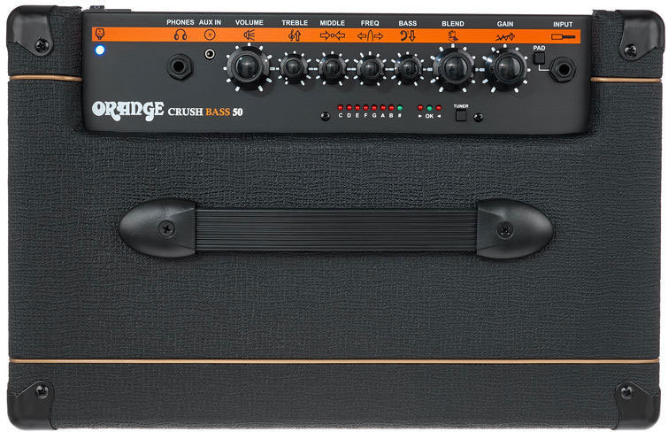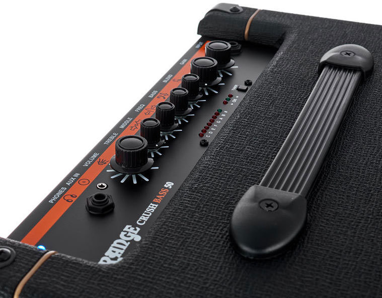 Crush Bass 50 имеет выход на наушники Cabsim схемы, который эмулирует резонанс сценических басовых динамиков во время бесшумной практики. Этот сигнал также может быть направлен для аутентичной прямой записи. Aux вход позволяет подключать внешние источники звука для минусовки, в то время как удобный встроенный тюнер служит для быстрой настройки между джемами.