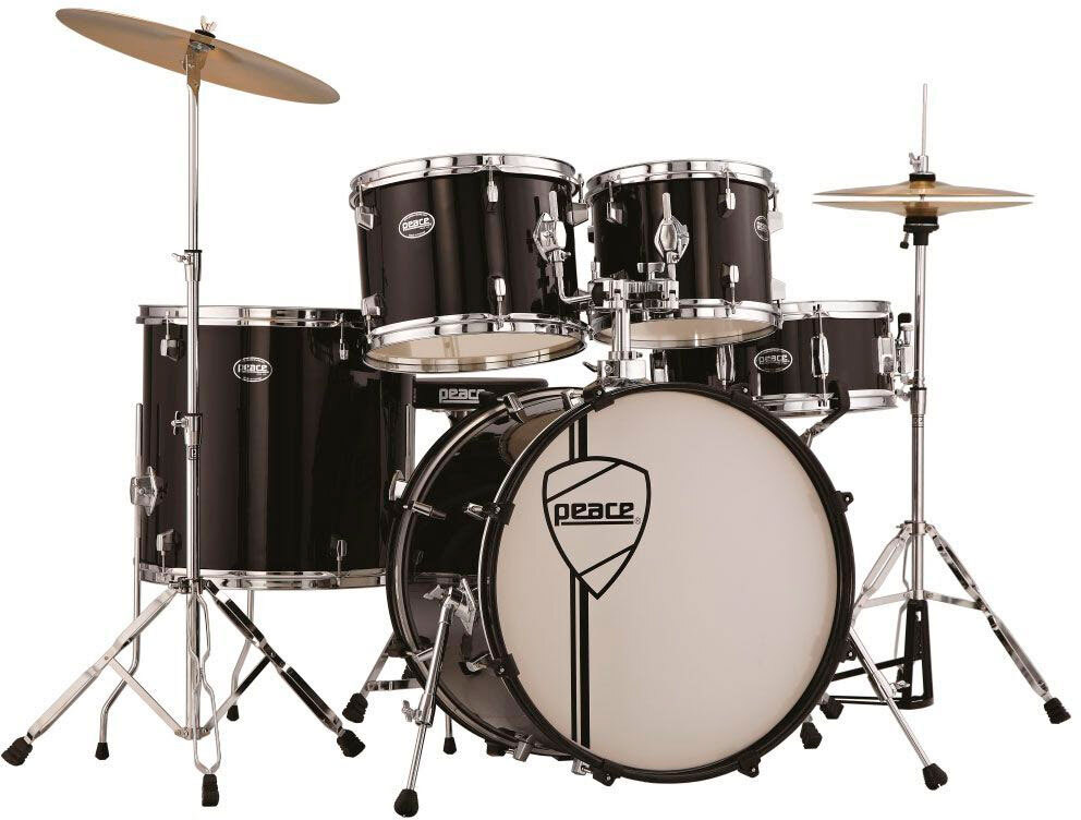 Peace DP-105CH-20 ударная установка #11 Black из 5-ти барабанов (10х8/12х9/14х5,5/16х15/20х14); хромированные лаги, обода и стойки серии Arena 600 (прямая под тарелку, под хай-хэт, под малый барабан, педаль, стул, тарелки хай-хэт 14'', тарелка крэш-райд 16', том-холдеры, палочки) 9 слоев махагони