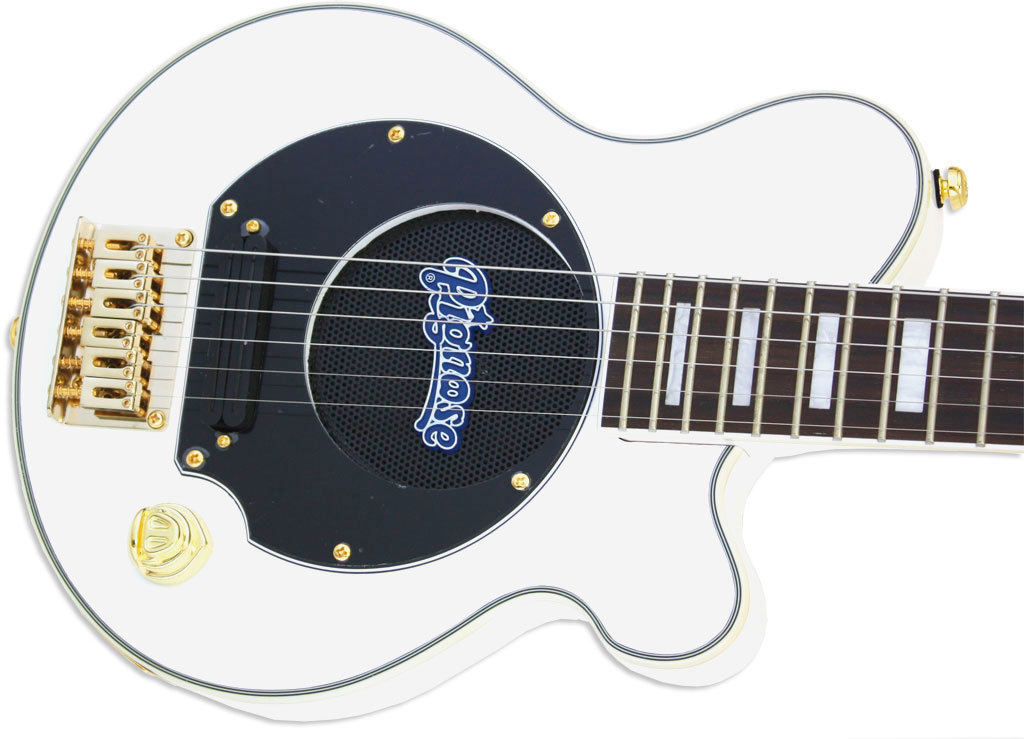 PGG-259 забавная и маленькая электрогитара со встроенным усилителем. Все что нужно сделать, это повернуть знаменитую ручку Pignose в виде пятачка поросенка, ударить по струнам и PGG-259 зазвучит своим знаменитым звуком прямо из гитары. PGG-259 имеет мензуру 24 1/4", 22 ладовую накладку из Techwood, кленовый гриф на болтах, фиксированный бридж и 1/4" выход для наушников, который также подходит для подключения гитарных усилителей. Кроме того, она оборудована одним оригинальным мини хамбакером, встроенным микро усилителем и металлическим регулятором громкости с push-pull on/off переключателем. Встроенный 1 Вт усилитель работает от 9В батарейки. PGG-259 действительно безупречная гитара с ее привлекательным внешним видом с многослойной окантовкой и золотой фурнитурой, а хамбакер даст Вам соблазнительный жирный звук дисторшна.