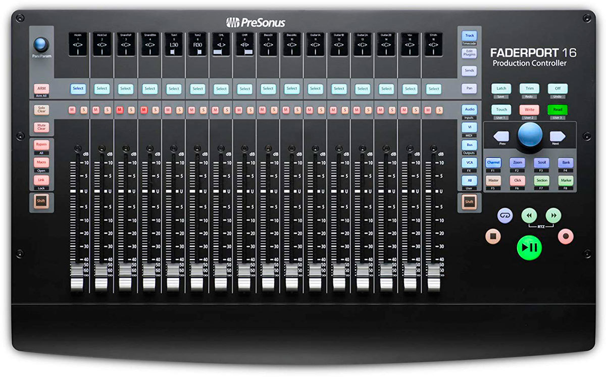 PreSonus Faderport 16 – 16-канальный продакшн-контроллер. Предусмотрена нативная поддержка Studio One. Помимо этого, поддерживаются протоколы Mackie Control и HUI, что обеспечивает совместимость со многими DAW, например, Pro Tools, Ableton Live, Cubase, Logic Pro X и Sonar.