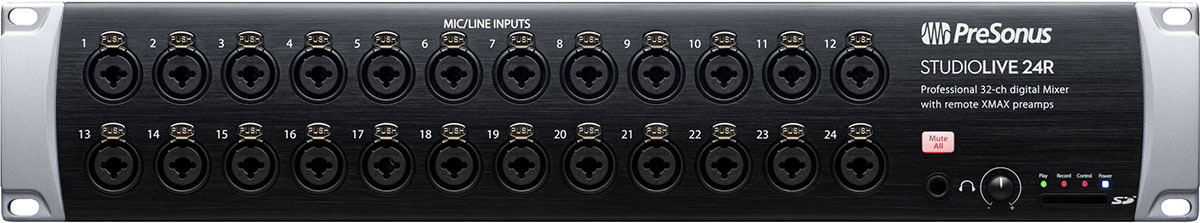 Модели 32R и 24R отличаются только количеством аналоговых входов и выходов, а по внутренним возможностям одинаковые и полностью соответствуют консольным моделям StudioLive Series III. Исключение составляет только модель 16R, имеющая более скромные возможности. К особенностям рековых моделей StudioLive Series III R относится кнопка Mute All, способная оперативно отключить сигнал со всех аналоговых входов.
