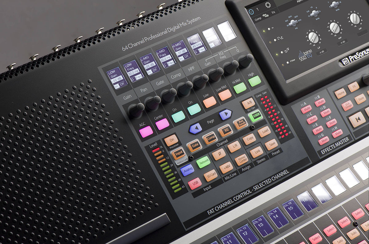 Микшеры PreSonus необычайно просты в использовании, имеют ясный и продуманный интерфейс. Для управления параметрами канала с помощью физических контроллеров предусмотрен блок FAT CHANNEL с 8 регуляторами и кнопками. Поклонников «планшетного» стиля работы порадует наличие 7” тачскрин дисплея. Для большей оперативности работы все фейдеры микшера оснащены дополнительными LCD дисплеями с подписью названия канала. В моделях 32S и 64S дополнительные LCD дисплеи установлены и для контроллеров FAT CHANNEL. В интерфейсе управления новыми микшерами широко применятся цветовая кодировка. Определёнными цветами подсветки кнопок обозначаются разный тип шин и различные типы подключенных к каналам входов. Также имеется возможность промаркировать различные входные каналы, в этом случае их кнопки select будут подсвечены в выбранный цвет.