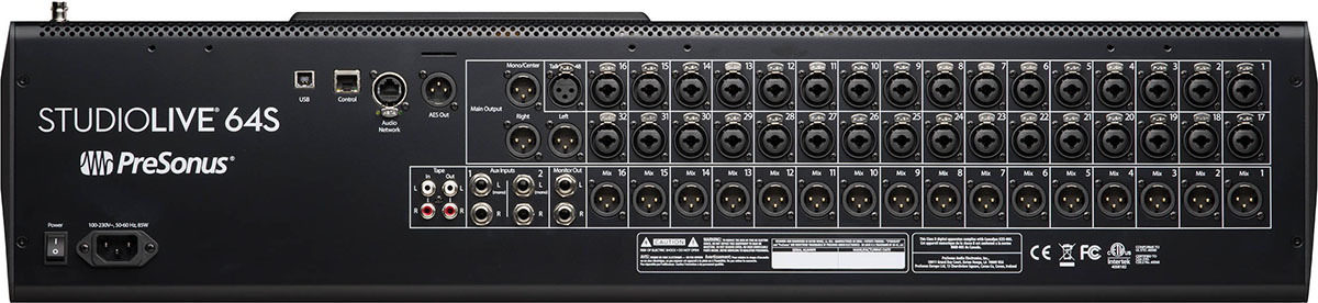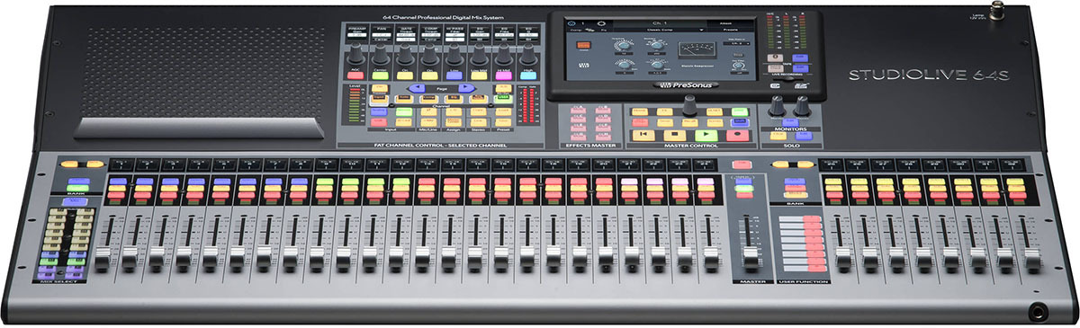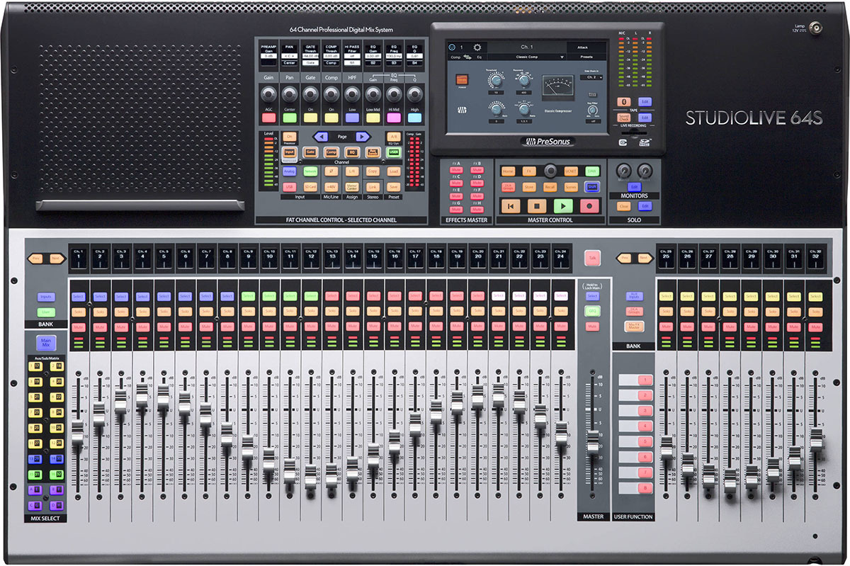 PreSonus StudioLive 64S цифровой микшер, 64 каналов + 16 возвратов, 32+1 фейдер, 38 аналоговых входов / 20 выходов, 8 FX, 32 MIX BUS, 16 GEQ, USB-audio, AVB-audio, AES/EBU out