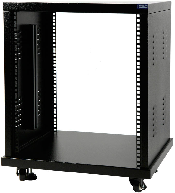 Металлическая рэковая стойка высотой 12U для стационарного использования. Может устанавливаться, как на резиновых ножках, так и на колесиках, идущих в комплекте. Также в комплекте идет набор болтов для крепления приборов в рэк. Для укрепления тяжелых приборов стойка комплектуется поддерживающими уголками для 6 приборов.