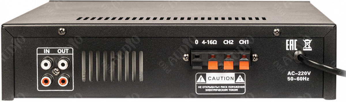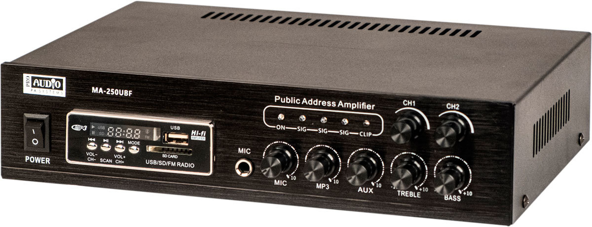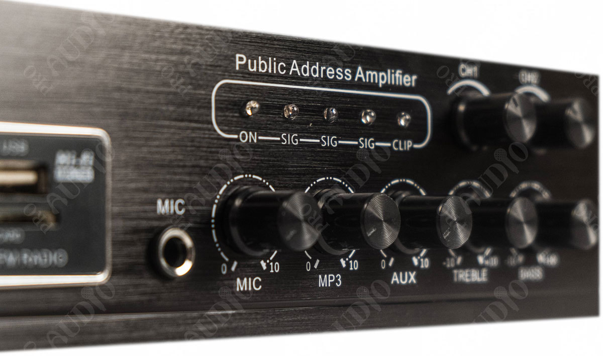 Трансляционный микшер-усилитель, предназначенный для организации фонового вещания в небольших магазинах, павильонах. В качестве источников сигнала можно использовать как встроенный USB/SD MP3-проигрыватель и FM-тюнер, так и внешние проигрыватели. Для этого у усилителя есть стереовход RCA с отдельным регулятором громкости. Для подключения динамических микрофонов или радиосистем имеется 1 вход TRS. Усилитель может работать как с трансформаторными АС, так и с низкоомными (сопротивлением не ниже 8 Ом).