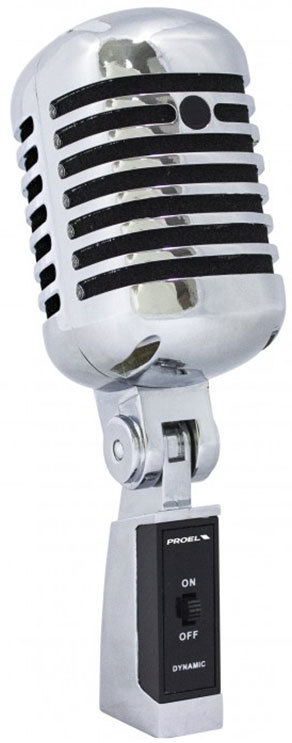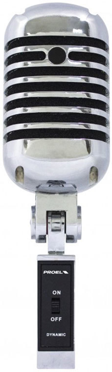Proel DM55 динамический кардиоидный микрофон, дизайн Shure 55, 50 Гц-16 кГц, макс.SPL 130 дБ, С/Ш >65 дБ, 300 Ом, хромированный корпус, кнопка вкл., 485 г, шт