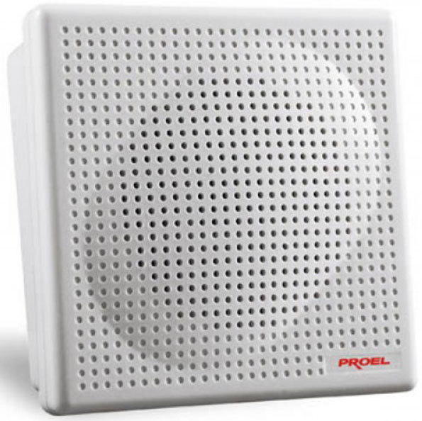 Proel PA WS01 настенный громкоговоритель, водонепроницаемый, квадратной формы, с пылезащитной решёткой защиты и встроенным трансформатором для работы на 100В. Драйвер 3", 3/1.5 Вт, 100В, 110 Гц - 13 кГц, 170º / 150º, корпус ABS пластик, цвет белый, IP55.