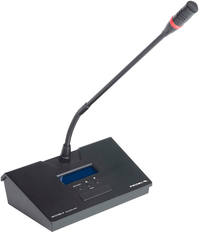 Proel WCS1000D беспроводная микрофонная станция делегата. Однонаправленный конденсаторный микрофон, 3 функциональные кнопки для выбора режима работы, кнопка Вкл/Выкл, радиус действия до 50 м, возможность подключения до 256 станций одновременно.