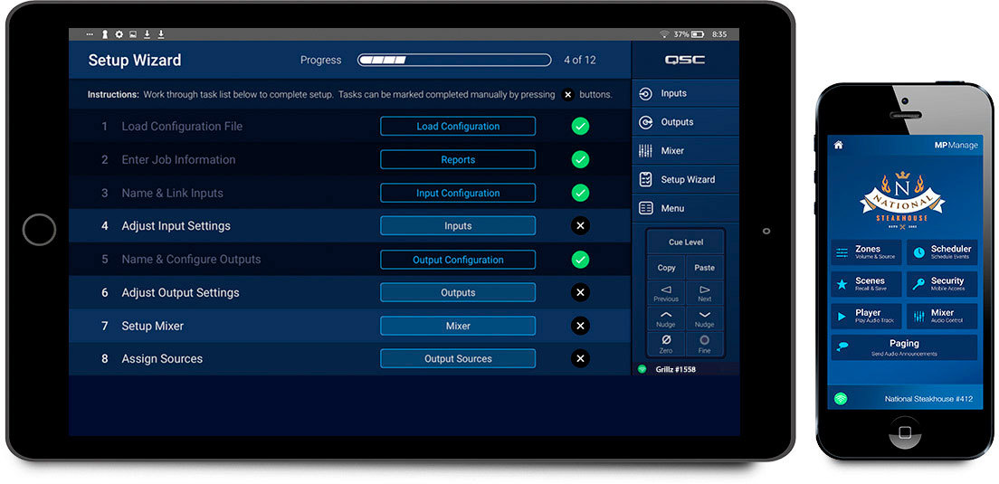 MP Install также позволяет настраивать конфигурацию управления для периферийных устройств. Приложение MP Manage (для планшетов и смартфонов на iOS / Android) обеспечивает беспроводную работу основных функций системы, включая контроль уровня зоны и выбор источника, вызов сцены, планирование и управление микшером. Он также предлагает уникальные функции хранения и пересылки данных.