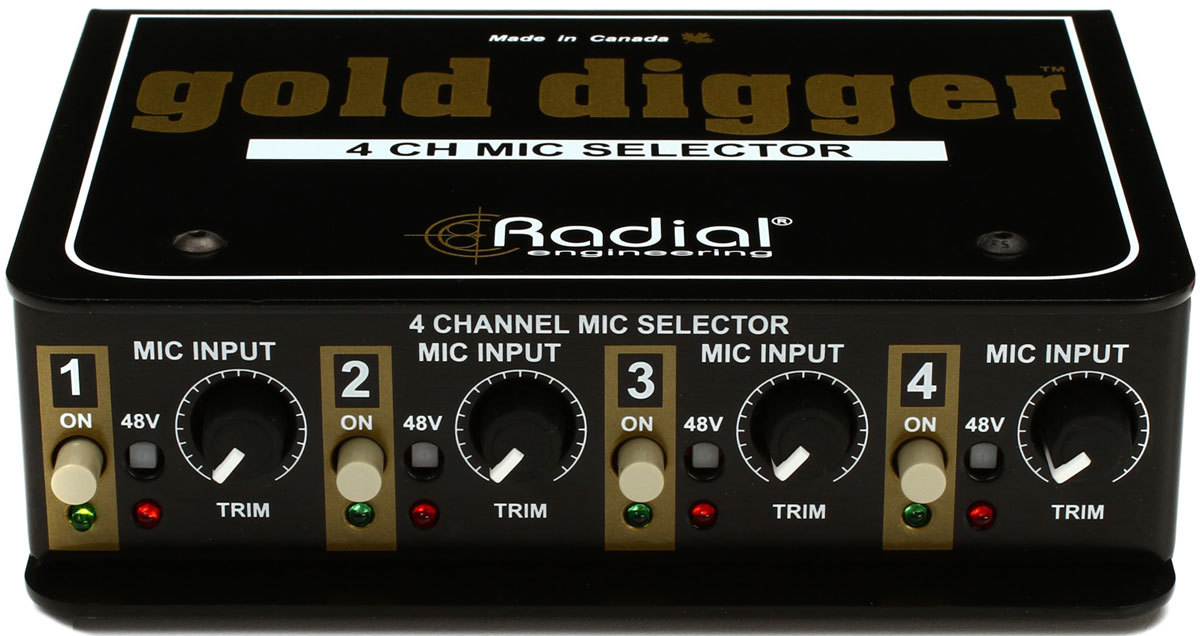 Основные характеристикиПроизводительRadialСтрана производстваКанада Срок гарантии12 месяцев Radial Gold Digger (MS4) селектор микроф. сигнала, 4 XLR входа, 1 XLR выход