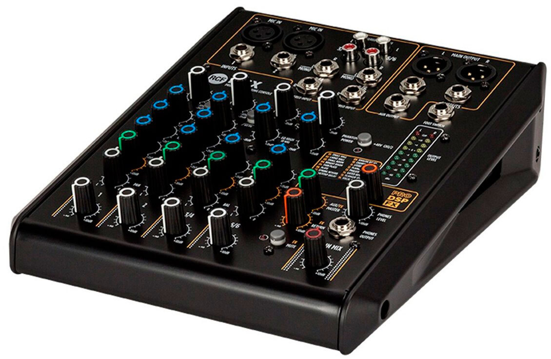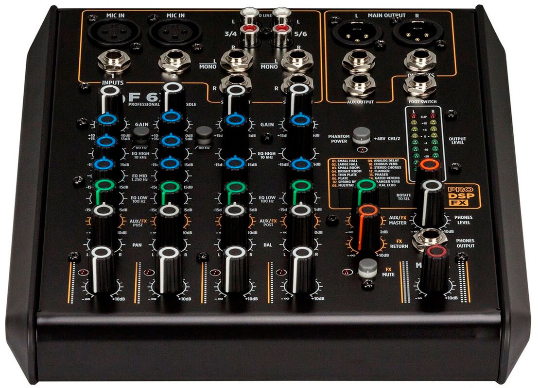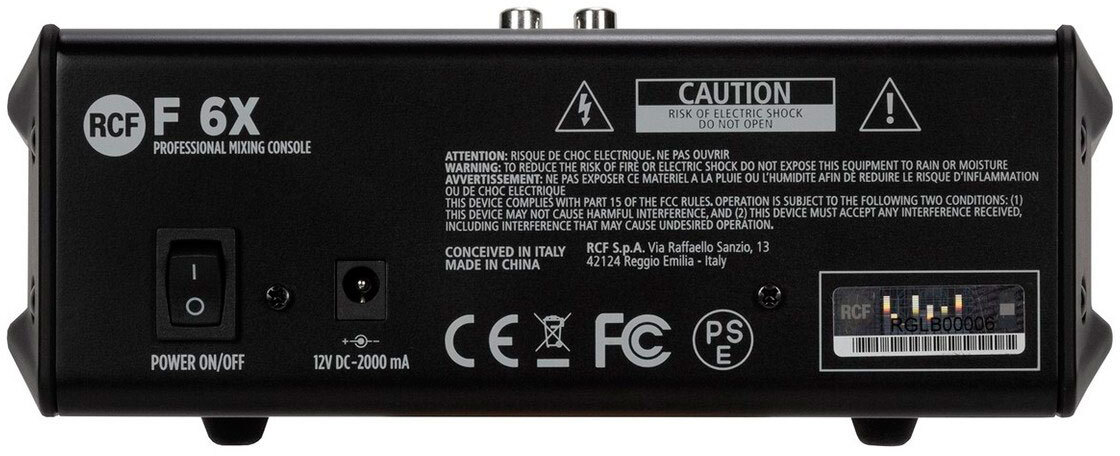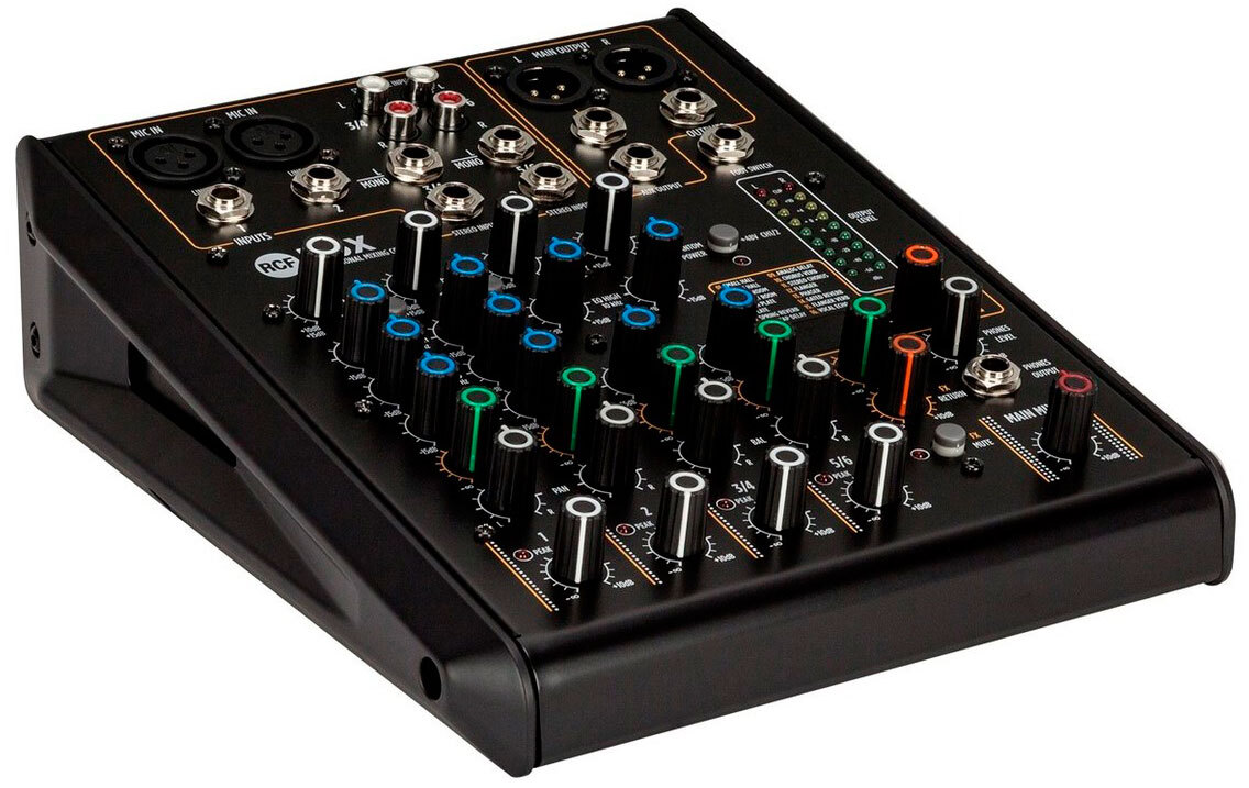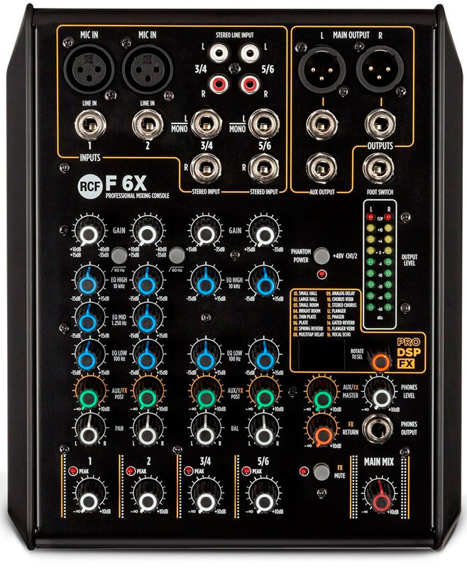 RCF F 6X Микшерный пульт, 2 микрофонных входа + 2 стерео входа, 1 AUX/FX посыл, процессор эффектов, 3-полосн./2-полосн. EQ, мастер выход XLR, внешний БП.