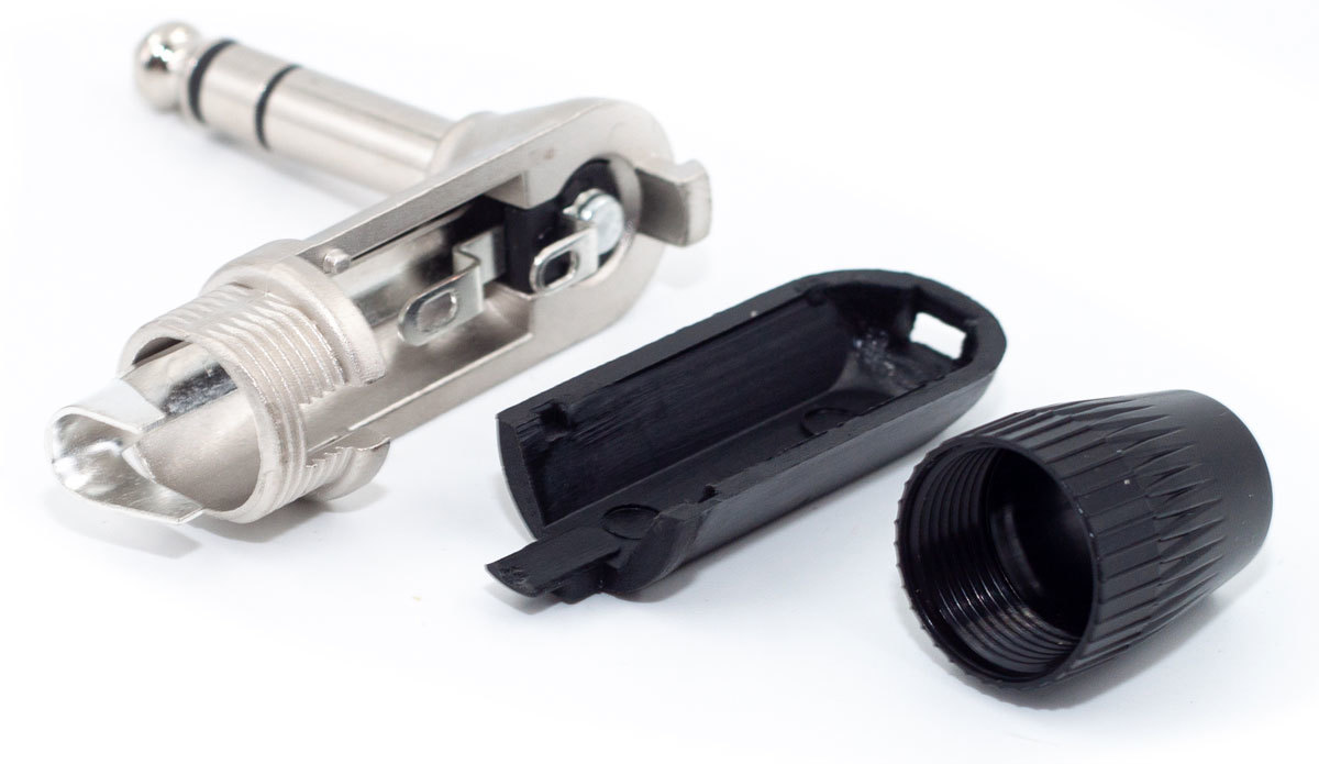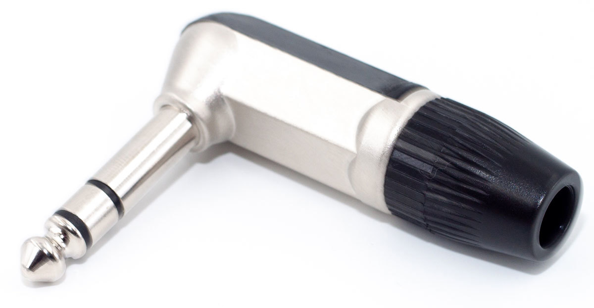 Кабельный разъем 1/4" Jack 6.35 мм, 3-х контактный (стерео) <штекер/папа>, угловой, металлический никелированный корпус прямоугольной формы, контакты - покрытие никель, под пайку, пластиковый колпачок черного цвета, на кабель диаметром до 6.0 мм.
